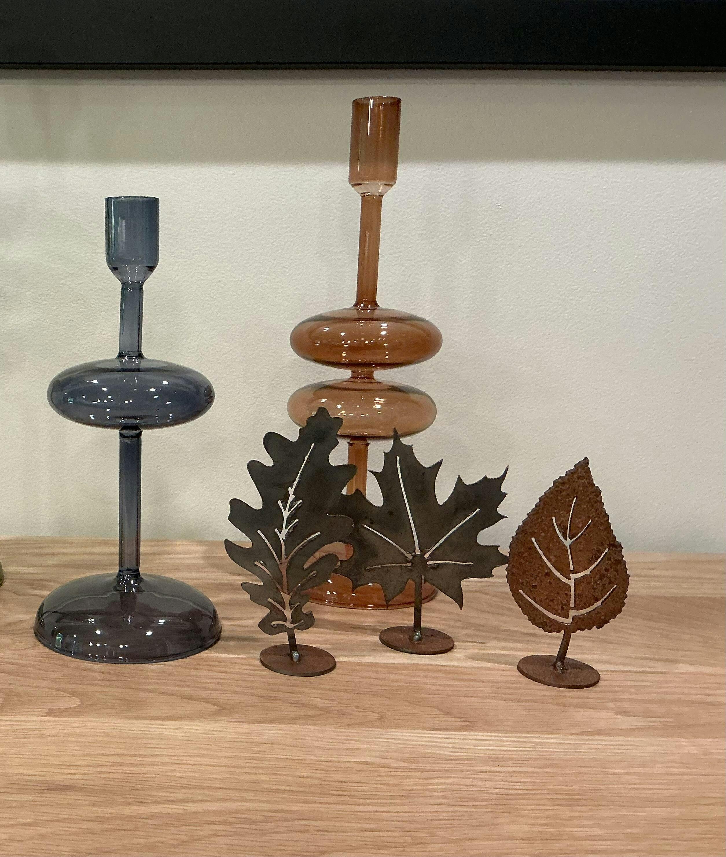 A simple metal cut-out of three different leaves; elm, maple, oak. Perfect rustic decor for the mantel or shelf. These leaves are cut from cold-rolled steel and are welded to small bases.