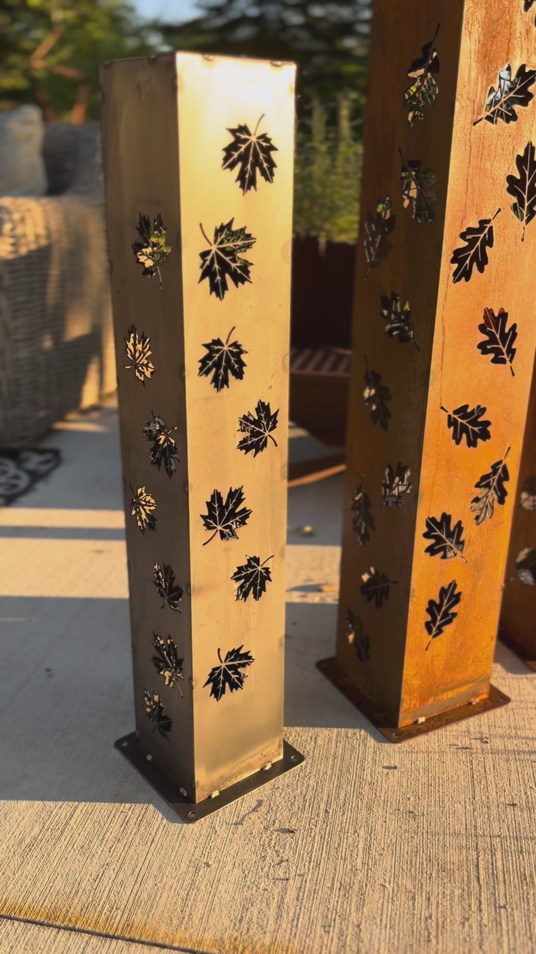 Bring the warmth of fall to your outdoor space with the Autumn Glow Luminary Collection. Crafted from durable steel and finished with intricate leaf cutouts, these solar-powered pillars cast a cozy glow through patterns of falling leaves. Perfect for patios, gardens, and walkways, they celebrate the beauty of autumn day and night.